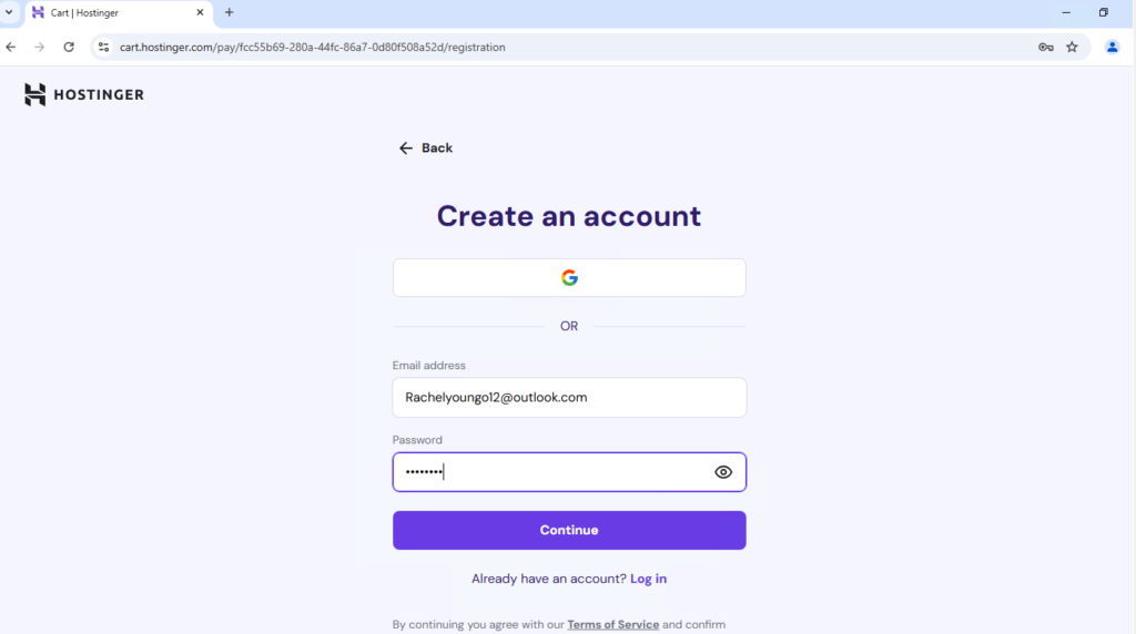 Click on the Continue button. Next, you’ll need to create a new Hostinger account. Provide your email address and set a password. Alternatively, you can create an account using your Google account for quicker registration.
