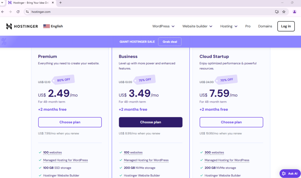 Go to the Hostinger official website. From there, choose your preferred hosting package, whether it’s Web Hosting, Cloud Hosting, or VPS Hosting, based on your requirements.